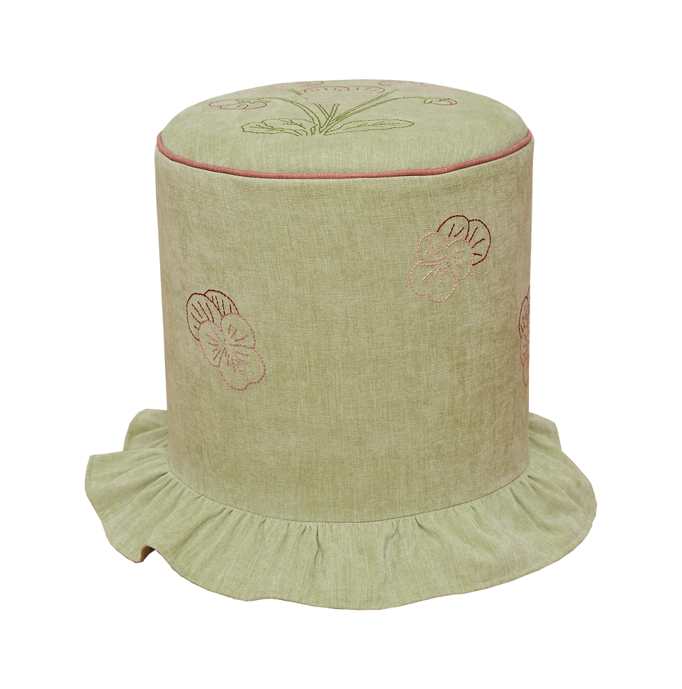 En möbel utöver det vanliga - mina sittpuffar är tillverkade för hand och klädda i tyger med unika handbroderad mönster, varje exemplar är ett konstverk i sig.